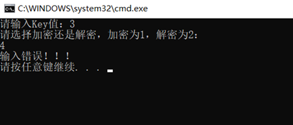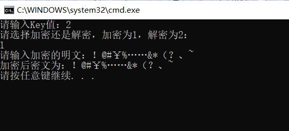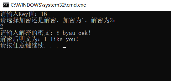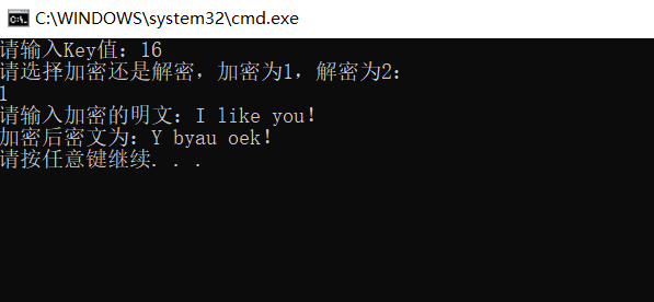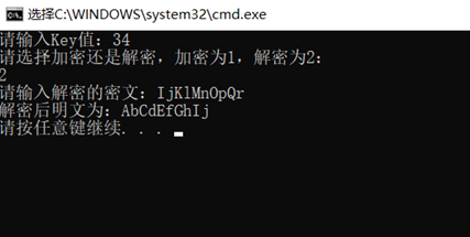 #include #include void kaisa_jiami(int key,char P[1000]){ //凯撒加密int i; //定义ichar C[1000]; //C为密文,定义密文字符串长度为1000for(i=0;i='A'&&P[i]<='Z'){//当输入明文在A—Z之间时,依次对字母进行加密C[i]=(P[i]+key-'A')%26+'A'; //执行加密算法:C=P+key(mod 26)}else if(P[i]>='a'&&P[i]<='z'){ //当输入明文在a—z之间时,依次对字母进行加密C[i]=(P[i]+key-'a')%26+'a'; //执行加密算法:C=P+key(mod 26) }else C[i]=P[i]; //当输入的明文为空格或其他字符时,不对明文进行加密处理}C[i]='\0'; //字符串结束printf("加密后密文为:%s\n",C); //输出加密后的密文}void kaisa_jiemi(int key,char C[1000]){ //凯撒解密int i; //定义ichar P[1000];//P为明文,定义明文字符串长度为1000for(i=0;i='A'&&C[i]<='Z'){//当输入明文在A—Z之间时,依次对字母进行解密P[i]=((C[i]-'A')+26-key)%26+'A'; //执行解密算法:P=C-key(mod 26)}else if(C[i]>='a'&&C[i]<='z'){ //当输入明文在a—z之间时,依次对字母进行解密P[i]=((C[i]-'a')+26-key)%26+'a'; //执行解密算法:P=C-key(mod 26)}else P[i]=C[i]; //当输入的密文为空格或其他字符时,不对密文进行解密处理}P[i]='\0'; //字符串结束printf("解密后明文为:%s\n",P); //输出“解密后的明文”}int main(){ //主函数int key,a; //key值为秘钥,其中key的有效值为0~25。a值用于判断加密还是解密char P[1000],C[1000]; //定义明文P,密文Cprintf("请输入Key值:"); //输出“请输入Key值:”scanf("%d",&key); //输入key值printf("请选择加密还是解密,加密为1,解密为2:\n"); //输出“请选择加密还是解密,加密为1,解密为2:”scanf("%d",&a); //输入a值if(a==1){ //如果输入的a值为1,则执行加密printf("请输入加密的明文:"); //输出“请输入加密的明文:”getchar(); //用来消除回车符,以免出现闪退gets(P); //输入明文Pkaisa_jiami(key,P); //根据输入的key值和明文P调用加密函数kaisa_jiami}else if(a==2){ //如果输入的a值为1,则执行加密printf("请输入解密的密文:"); //输出“请输入解密的密文:”getchar(); //用来消除回车符,以免出现闪退gets(C); //输入密文Ckaisa_jiemi(key,C); //根据输入的key值和密文C调用解密函数kaisa_jiemi}else{printf("输入错误!!!\n");//如果输入其他数值,则输出“输入错误!!!”,结束程序}}