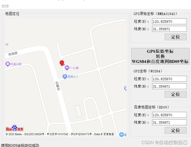 对于 GPS 经纬度测试工具 v2.0 的可视化, 我们可以先从串口输出信息中的提取出经纬度信息, 然后再输入到经纬度测试工具中进行图像可视化, 下图为经纬度测试工具得到的结果与手机上高德地图 APP 得到的结果的对比图。