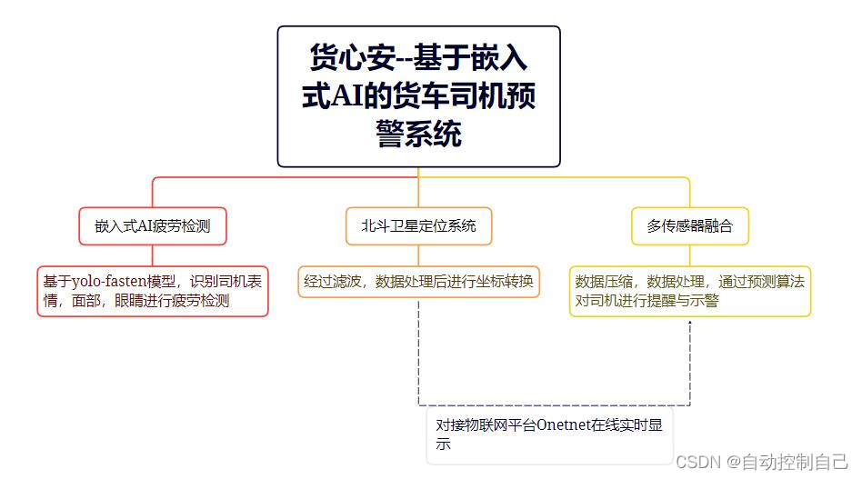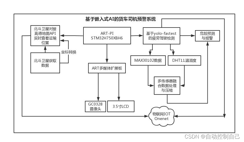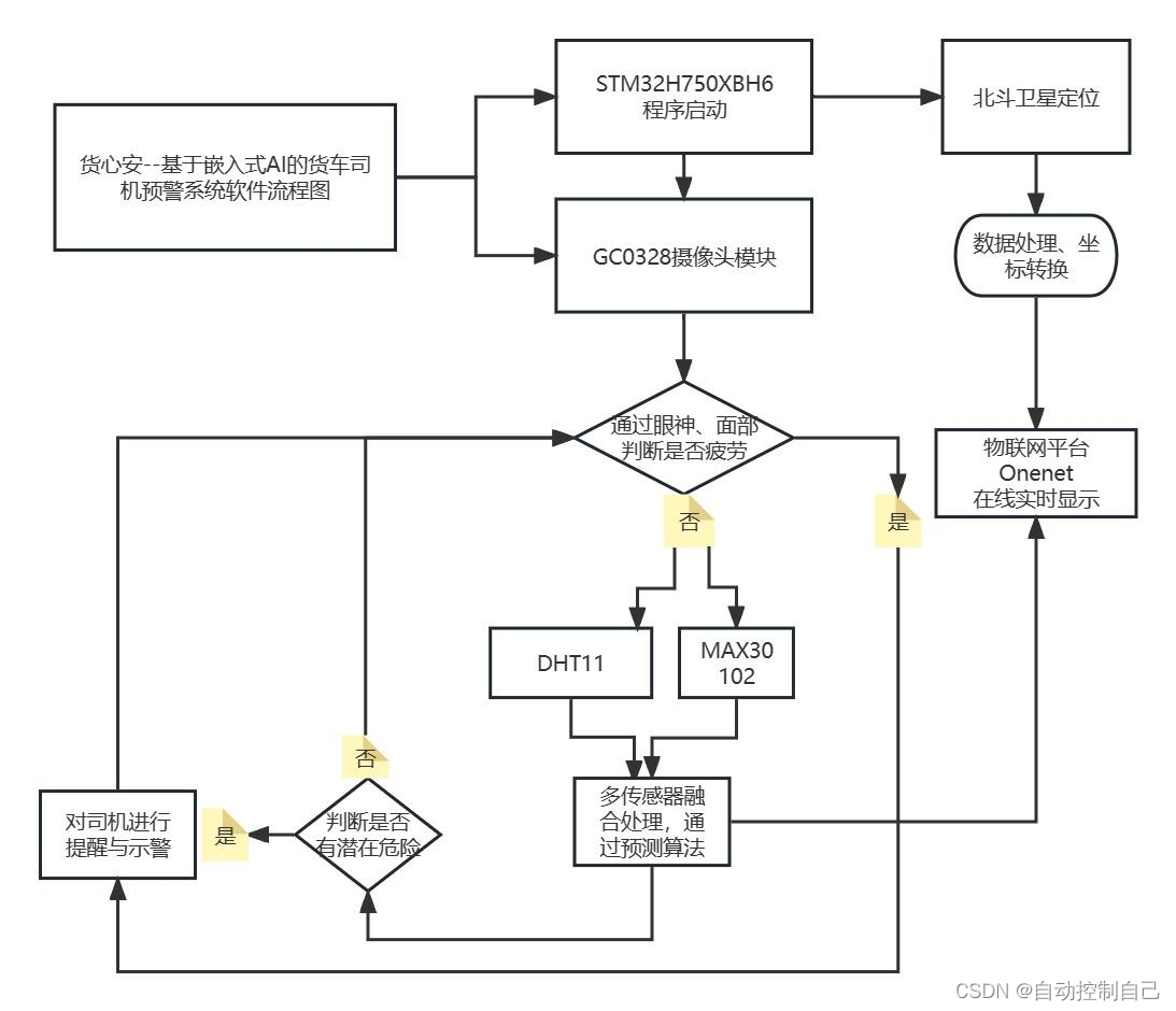 程序启动后, 先进行串口和摄像头初始化以保证后续程序正常执行, 从摄像头获取每帧画面经过图片预处理后输入部署上的神经网络进行推理, 得到推理结果后显示在多媒体扩展版的 LCD 屏上, 同时通过识别眼神, 面部判断是否疲劳进行示警与提醒。 通过多传感器融合判断司机状态, 对潜在的危险进行预测, 北斗卫星以及多传感器连接物联网平台 Onenet 实现实时查看数据。 保卫司机安全。
