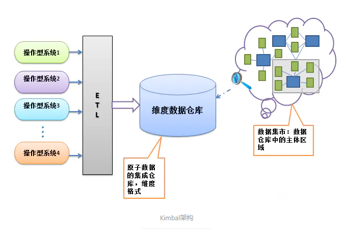 Kimball的维度数据仓库是基于维度模型建立的企业级数据仓库,它的架构有的时候可以称之为“总线体系结构”,Kimball 模式从流程上看是是自底向上的,即从数据集市到数据仓库再到数据源(先有数据集市再有数据仓库)的一种敏捷开发方法。对于Kimball模式,数据源往往是给定的若干个数据库表,数据较为稳定但是数据之间的关联关系比较复杂,需要从这些OLTP中产生的事务型数据结构抽取出分析型数据结构,再放入数据集市中方便下一步的BI与决策支持。