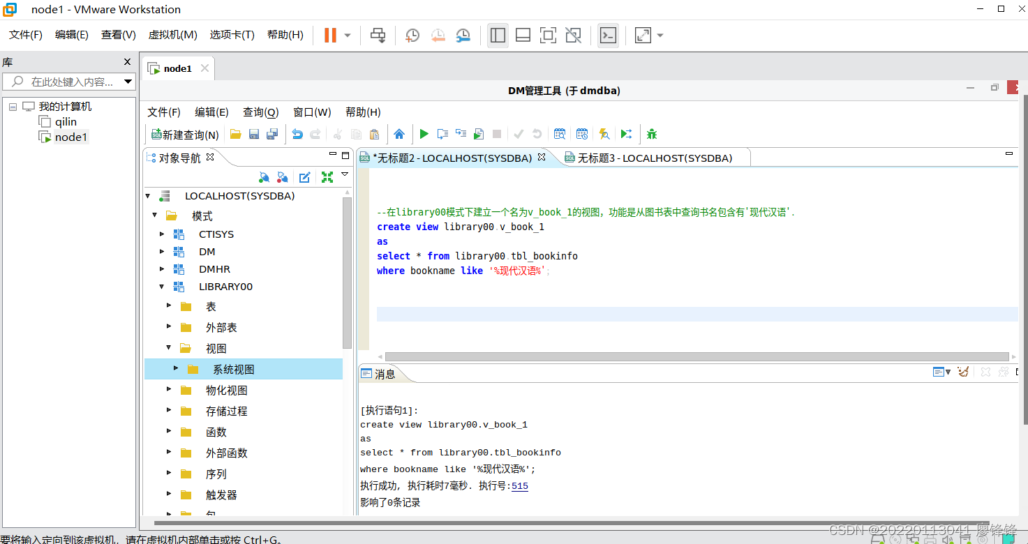 在library00模式下建立一个名为v_book_1的视图,功能是从图书表中查询书名包含有‘现代汉语’。