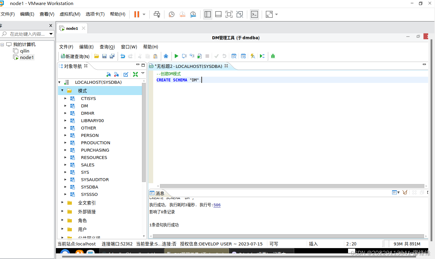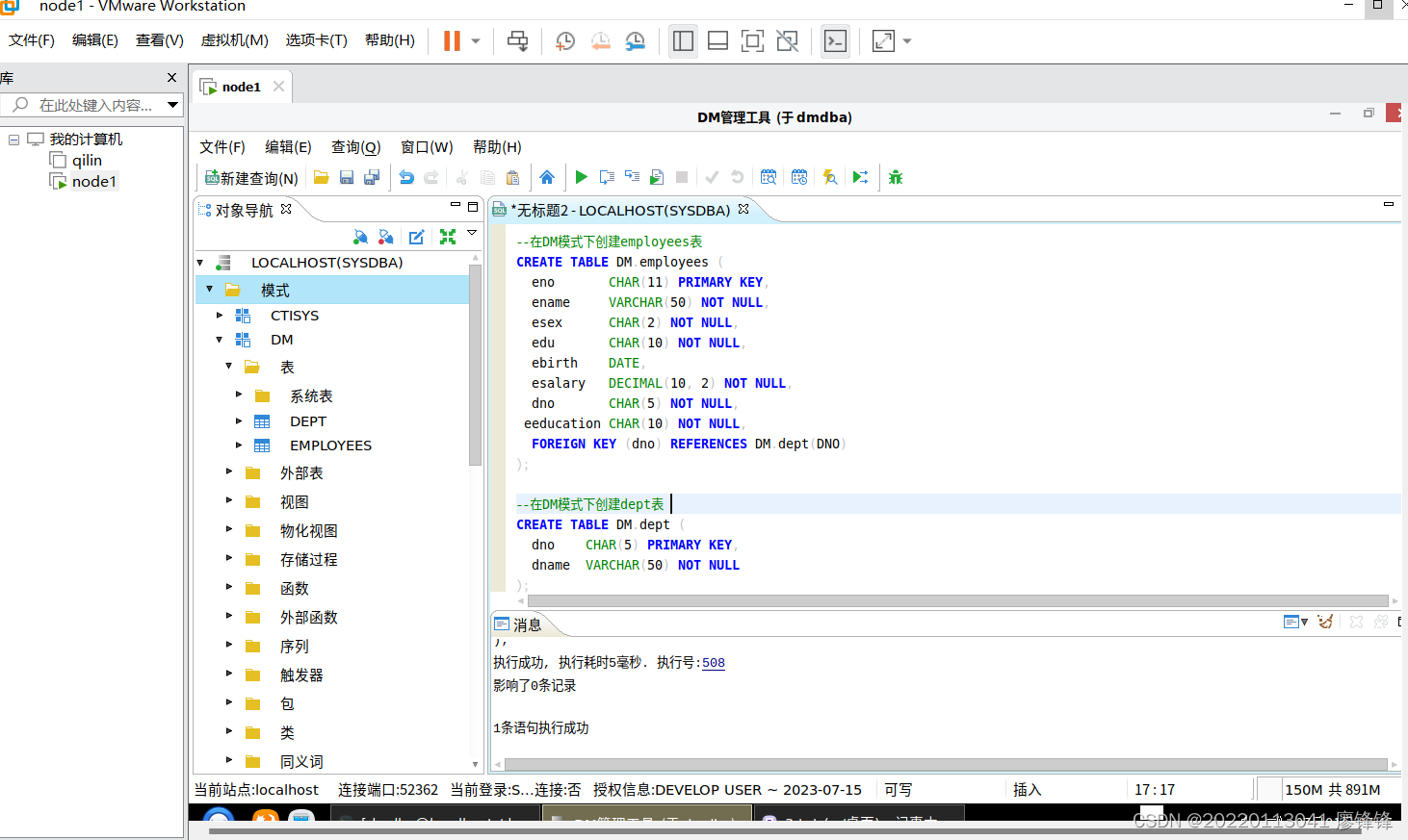 3.语句创建表:在DM模式下创建dept表和emloyees表,设置字段、数据类型、非空等等
