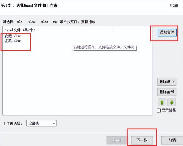 5.选择【添加文件】,将这两个工作簿添加进去,然后点击【下一步】