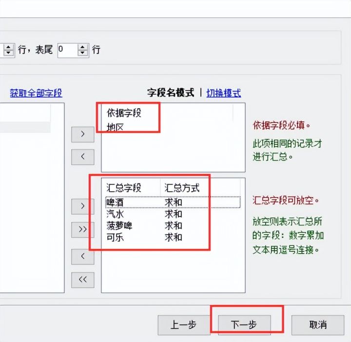 7.将地区字段移动到【依据字段】,其余字段移动到【汇总字段】,然后选择【下一步】
