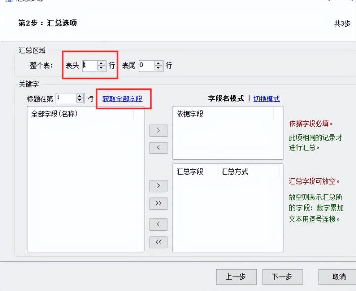 6.表头】选项设置为1,然后点击【获取全部字段】