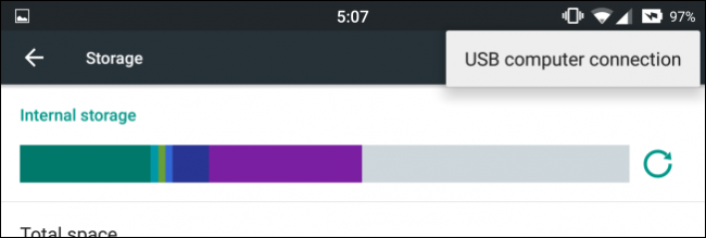 在开始使用Android File Transfer之前,最好先确保已正确配置Android设备。 首先点击打开“存储”设置,然后从右上角打开“ USB计算机连接”。