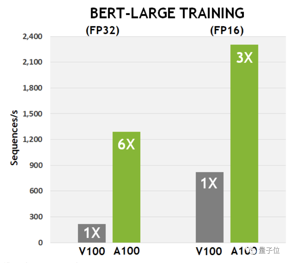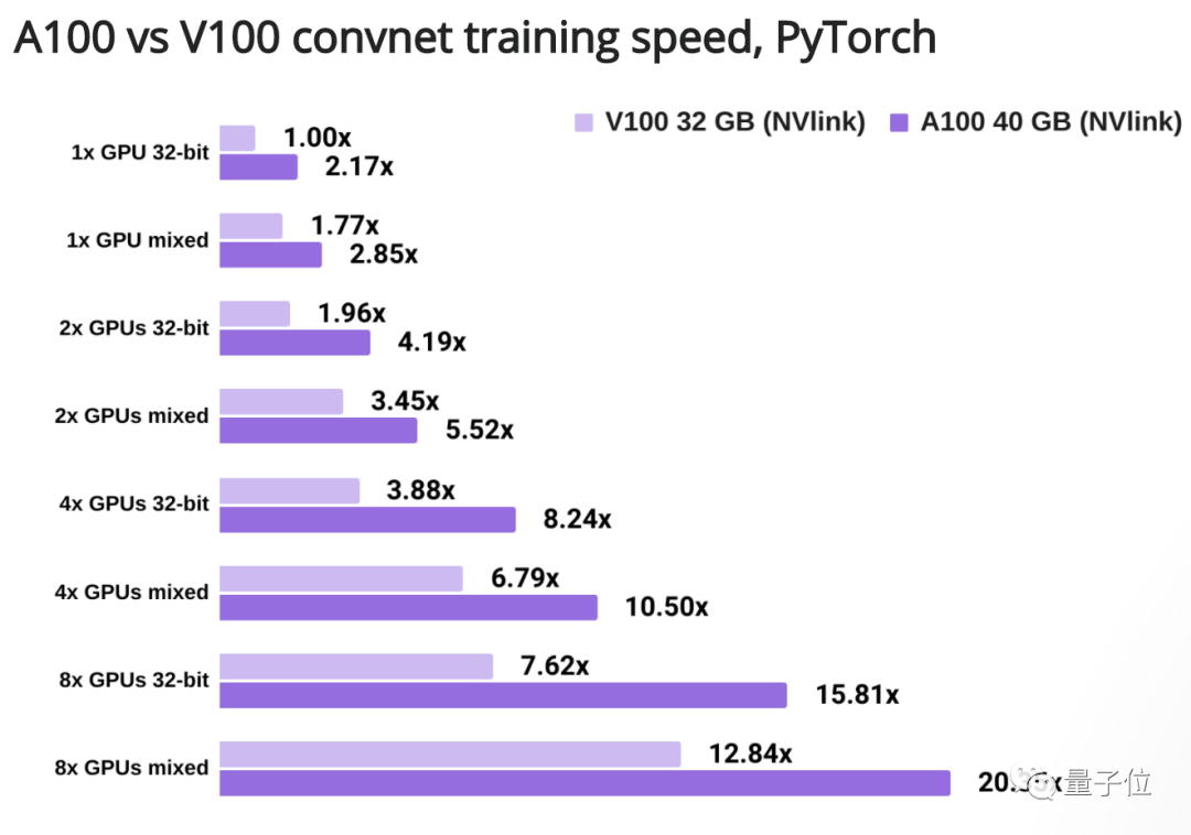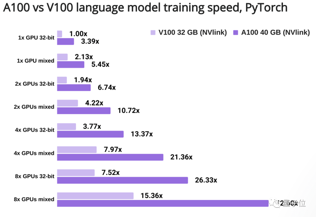 其中,分别用8块A100与8块V100,进行32位训练:前者速度能够达到后者的3.5倍;