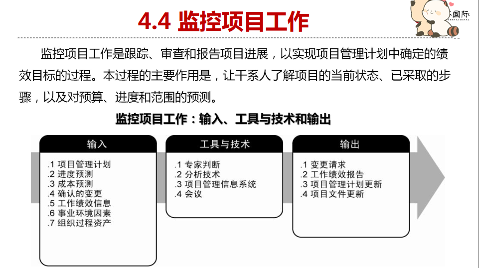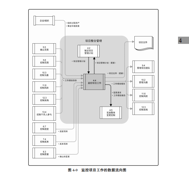 监控项目工作是跟踪、审查和报告项目进展,以实现项目管理计划中确定的绩效目标的 过程。 本过程的主要作用是, 让干系人了解项目的当前状态、已采取的步骤,以及对预算、 进度和范围的预测。