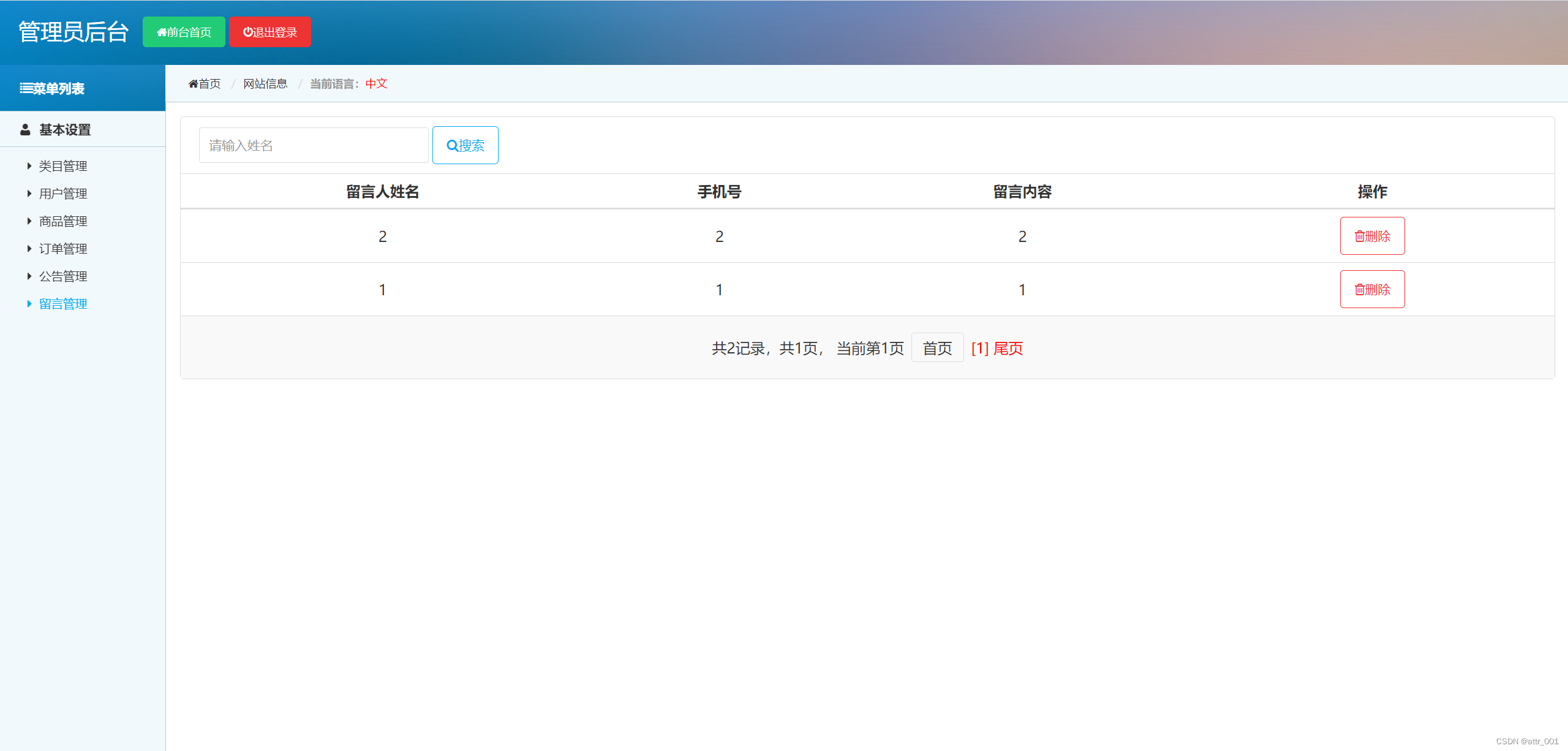 (5) 留言板管理:系统管理员可以在系统后台查看客户的留言信息,并且对于一些不友好的留言信息可以进行删除。