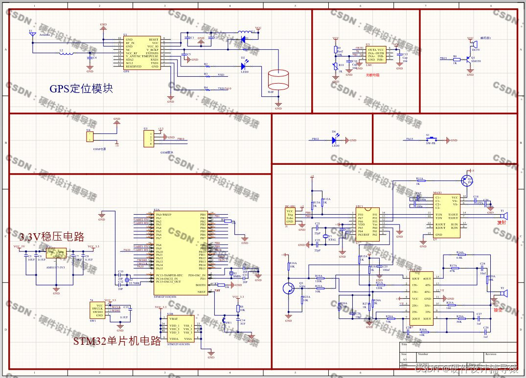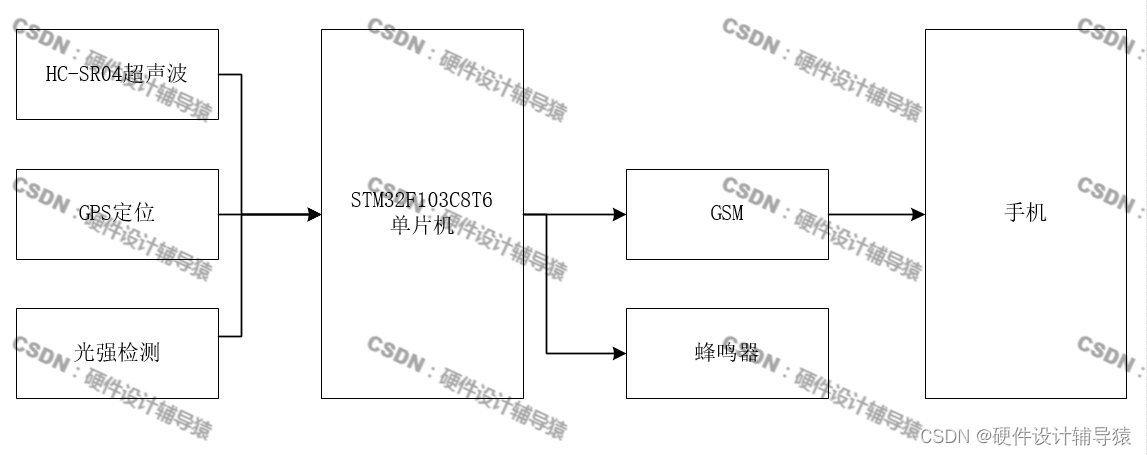 本设计所采用的STM32F103C8T6是以Cortex-3为核心的单片机,它的功能是实现软件的执行,并对外部的器件、模块进行控制,该系统主要由GPS定位模块,GSM模块,光敏电阻模块,HC-SR04超声波模块组成。