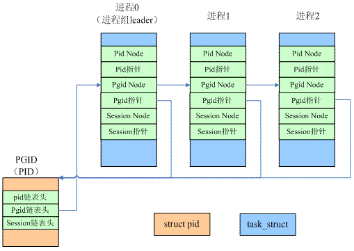 对于那些multi-thread进程,内核有若干个task struct和进程对应,不过为了简单,在上面图片中,进程x 对应的task struct实际上是thread group leader对应的那个task struct。这些task struct的pgid指针(task->pids[PIDTYPE_PGID].pid)指向了该进程组对应的struct pid数据对象。而该pid中的pgid链表头串联了所有使用该pid的task struct(仅仅是串联thread group leader对应的那些task struct),而链表中的第一个节点就是进程组leader。