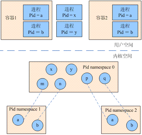 从用户空间来看,每一个进程都可以调用getpid来获取标识该进程的ID,我们称之PID,其类型是pid_t。因此,我们知道在用户空间可以通过一个正整数来唯一标识一个进程(我们称这个正整数为pid number)。在引入容器之后,事情稍微复杂一点,pid这个正整数只能是唯一标识容器内的进程。也就是说,如果有容器1和容器2存在于系统中,那么可以同时存在两个pid等于a的进程,分别位于容器1和容器2。当然,进程也可以不在容器里,例如进程x和进程y,它们就类似传统的linux系统中的进程。当然,你也可以认为进程x和进程y位于一个系统级别的顶层容器0,其中包括进程x和进程y以及两个容器。同样的概念,容器2中也可以嵌套一个容器,从而形成了一个container hierarchy。