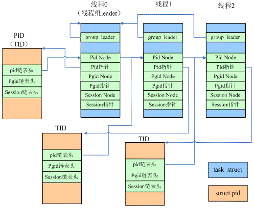 对于一个进程中的多个线程而言,每一个线程都可以通过task->pids[PIDTYPE_PID].pid找到该线程对应的表示thread ID的那个struct pid数据对象。当然,任何一个线程都有其所属的进程,也就是有表示其process id的那个struct pid数据对象。如何找到它呢?这需要一个桥梁,也就是task struct中定义的thread group 成员(task->group_leader),通过该指针,一个线程总是很容易的找到其对应的线程组leader,而线程组leader对应的pid就是该线程的process ID。因此,对于一个线程,其task->group_leader->pids[PIDTYPE_PID].pid就指向了表示其process id的那个struct pid数据对象。当然,对于线程组leader,其thread ID和process ID的struct pid数据对象是一个实体,对于非线程组leader的那些普通线程,其thread ID和process ID的struct pid数据对象指向不同的实体。
