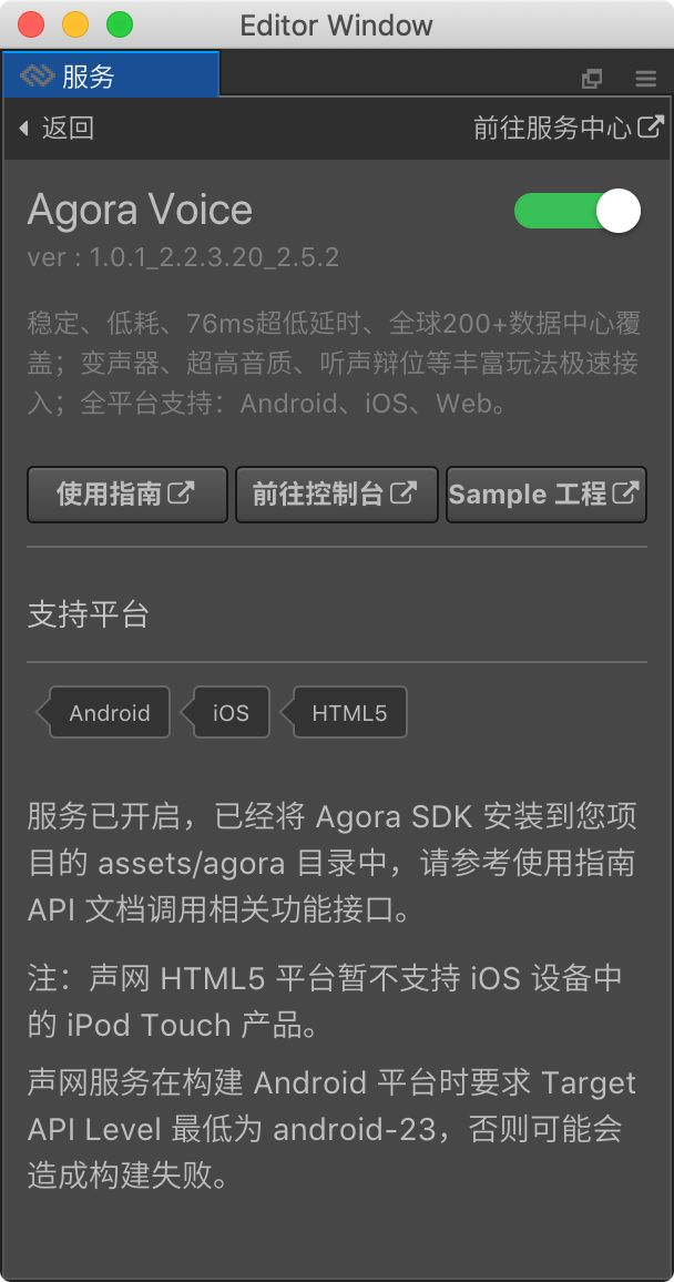 在屏幕右侧出现的 服务面板中选择 AgoraVoice,并点击 启用。Cocos Creator 会自动下载和配置所有声网服务依赖的资源。