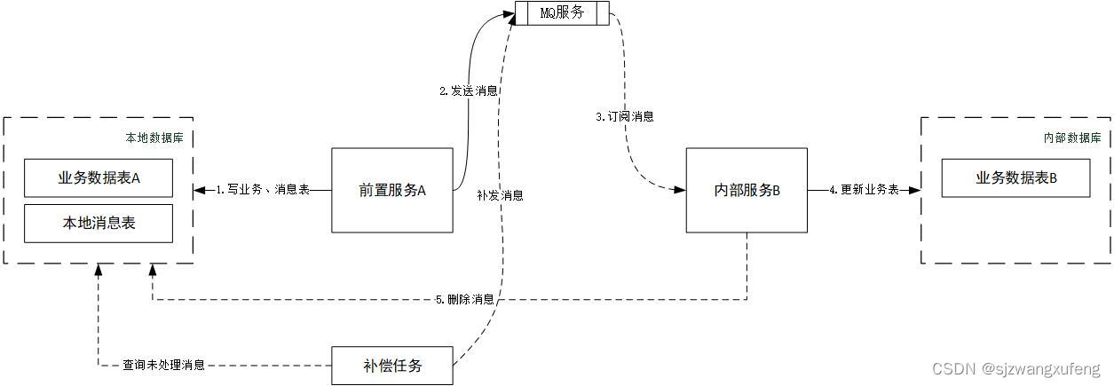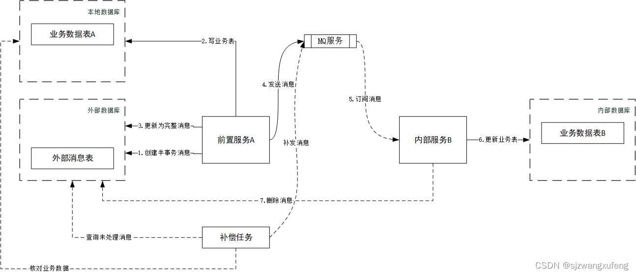 b. 步骤5: 删除消息,只是笼统的描述,也可以修改消息状态,总之"补偿任务"可以识别,不在补发消息就可以。根据实际业务场景,可通过数据库、mq、api接口等方式来"删除消息"。