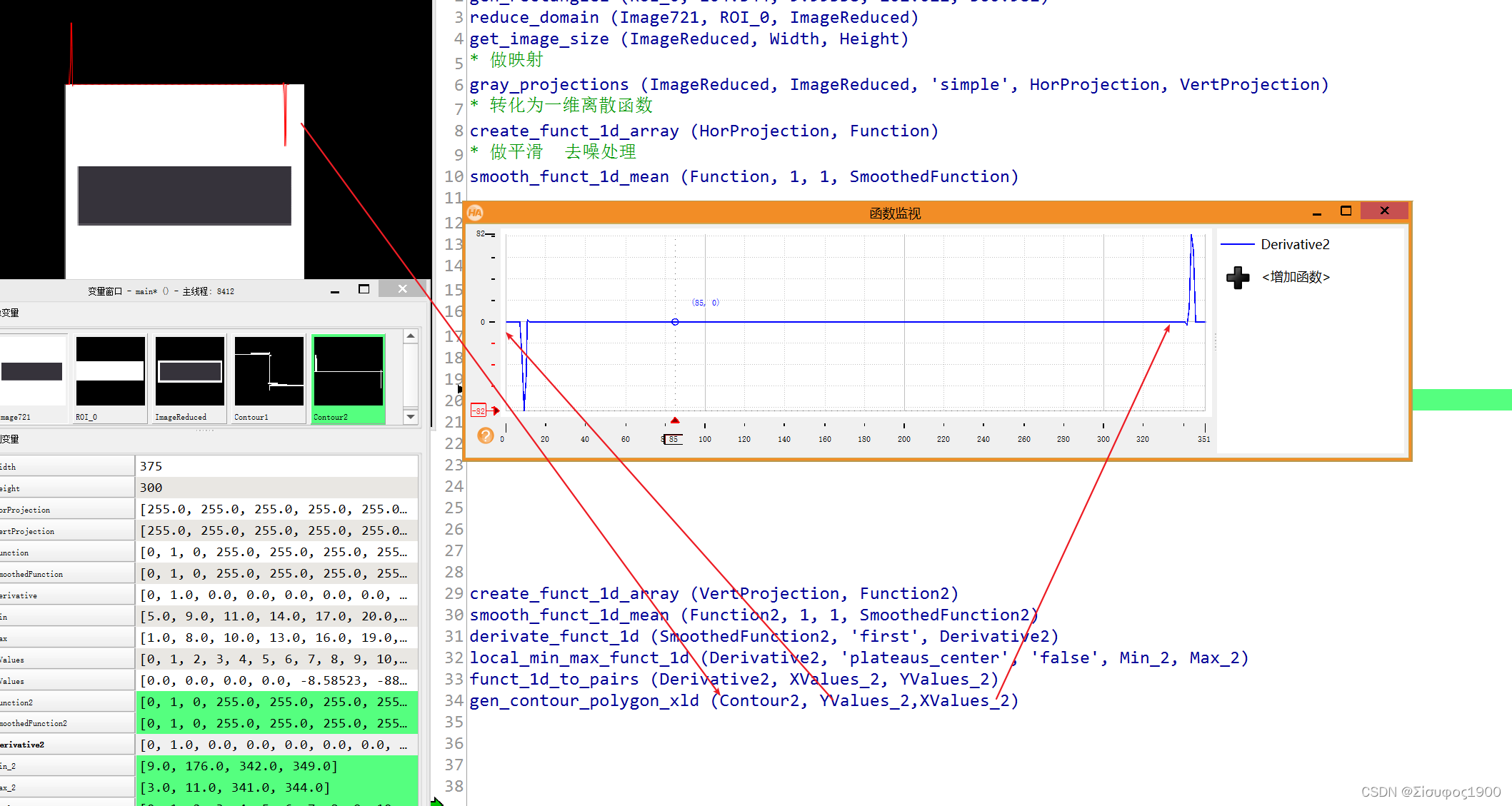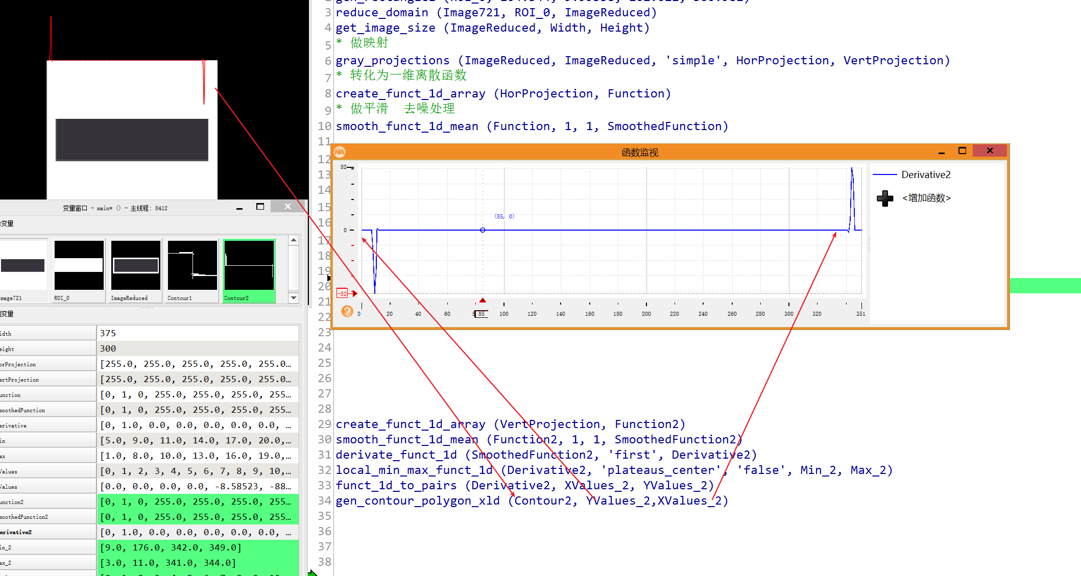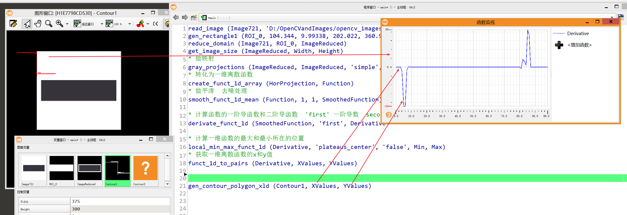 funct_1d_to_pairs (Derivative, XValues, YValues)gen_contour_polygon_xld (Contour1, XValues, YValues)create_funct_1d_array (VertProjection, Function2)