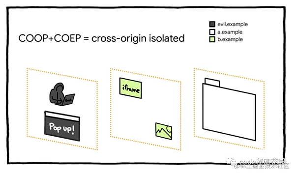 在浏览器中,不同网站的不同文档可以在同一进程中运行,两个网站共享一个浏览上下文组,可能处于同一进程中,攻击者可利用Spectre等漏洞窃取用户信息。为了减轻这种风险,浏览器提供了一个基于选择加入的隔离环境,称为“跨源隔离”,上述那些API都需要在跨域隔离的环境下才能使用。