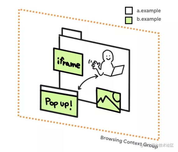 浏览器上下文组(Browsing Context Group)是一组共享相同上下文的 tab、window或iframe。例如,如果网站a.example打开弹出窗口b.example,则打开器窗口和弹出窗口共享相同的浏览上下文,并且它们可以通过 DOM API相互访问,例如 window.opener.postMessage()。一般来说,我们认为同一个上下文组中的内容都处于同一个进程。