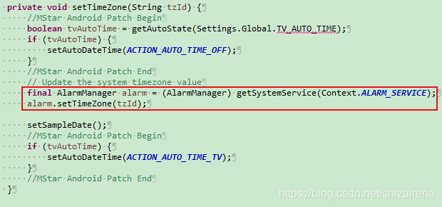 首先我们看一下android的原生设置中的逻辑,代码位置在原生设置setting中的com.android.tv.settings.system.DateTimeActivity.java中。在这个类中,很容易找到其中的setTimeZone方法。而其中的alarm.setTimeZone(tzId);正是设置时区的关键代码,其中tzId是String类型的,其实就是时区id。