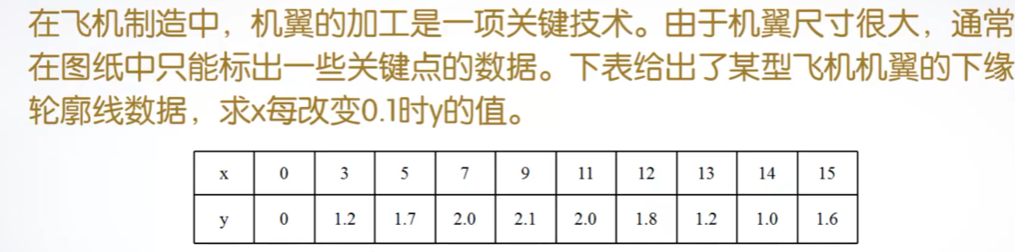 我们看一下上面零件加工的例子,从图中我们发现x和y是离散的点,我们需要利用插值,计算出x每改变0.1时y的值。代码如下,我们根据已知点,完成插值,并绘图观察。