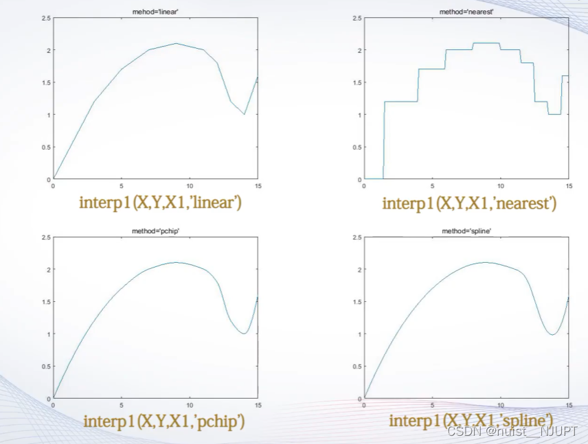 (1)linear,线性插值,默认插值方法,将与插值点靠近的两个点用直线连接,然后在直线上选取插值点。