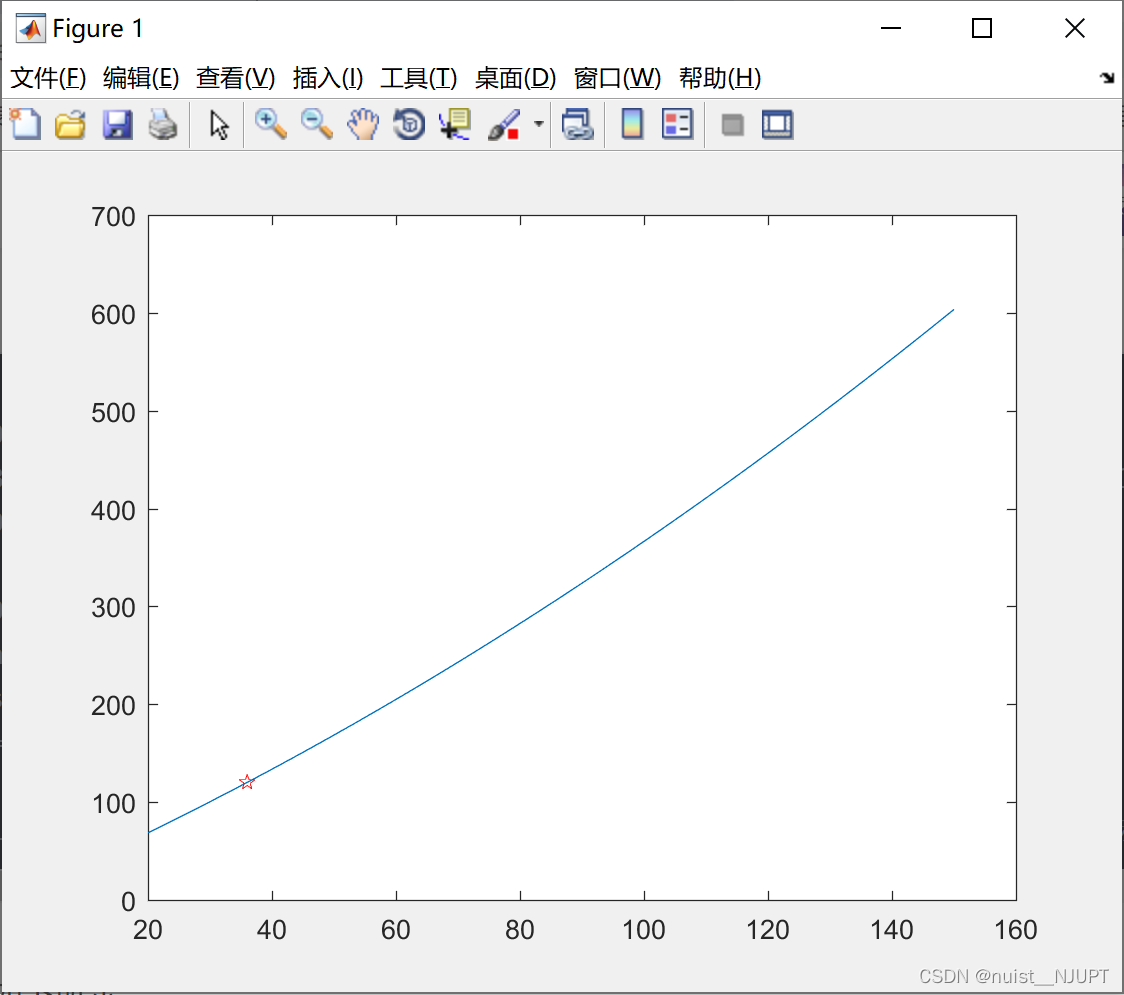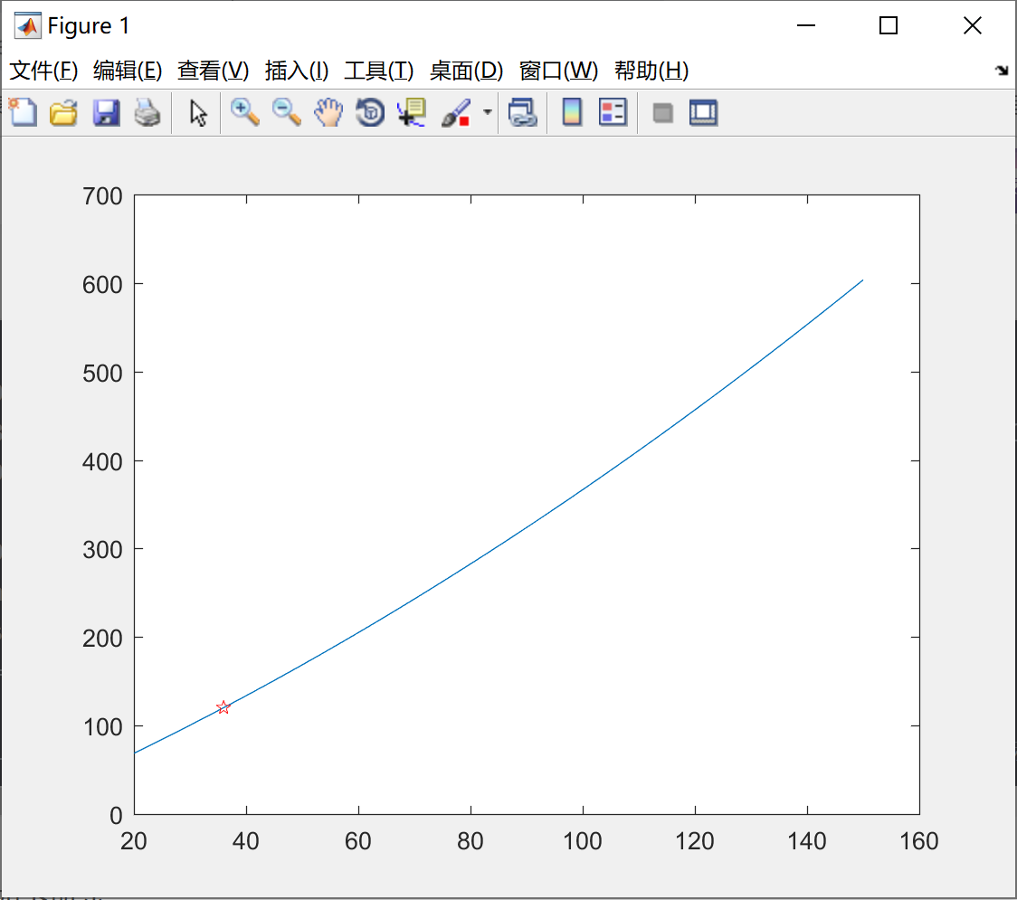 plot(vi, di, vi(i(1)), di(i(1)), 'rp') ; %绘图并标记速度与120m停车视距对应的坐标
