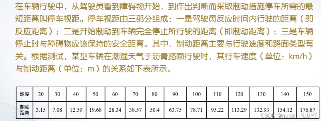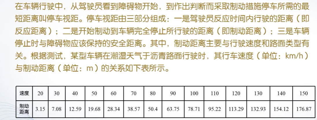 通过分析,我们可以做一下假设,先假设车速为v,停车视距为d,反应距离为d1,制动距离为d2,安全距离为d3,反应时间为as,故可以得到:d1=as*v,d2是v的函数,具体的函数未知。