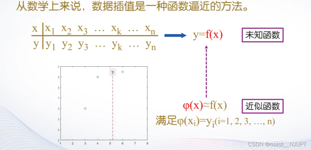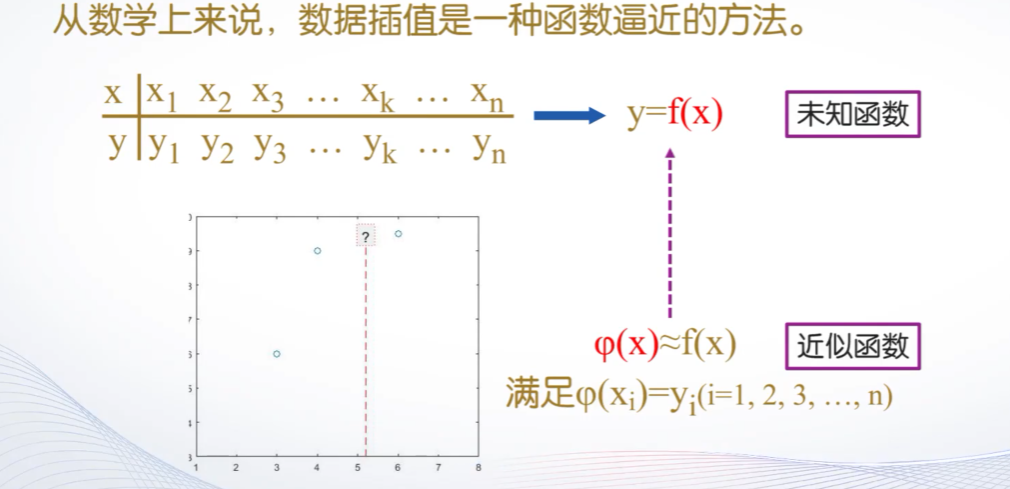 我们可以理解数据插值就算一种函数逼近的方法,就算就是根据离散数据点,找到一个近似函数去逼近未知函数,有了这个近似函数,我们就可以计算样本区间内的所有值了。