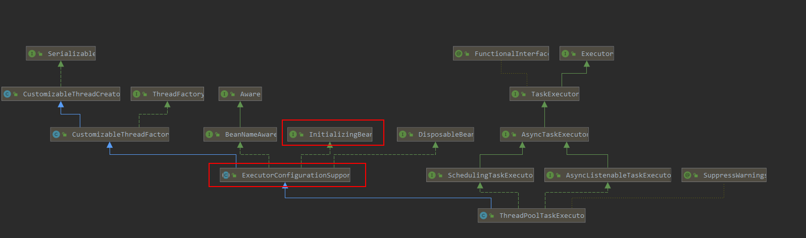 1、当ThreadPoolTaskExecutor当做Bean注入到Spring容器时,由于Spring的特殊性,ThreadPoolTaskExecutor的父类实现了initalizingBean类,里面的方法是afterPropertiesSet()。所以当ThreadPoolTaskExecutor注入到容器时,其父类ExecutorConfigurationSupport会执行afterPropertiesSet()方法将线程池做了初始化,过程如下: