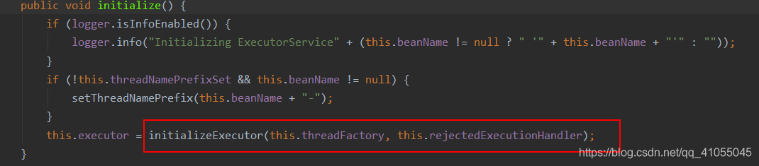 2、当然不是作为Bean的时候,需要自己手动去调用initialize()方法,其实也是调用到ExecutorConfigurationSupport类initialize()方法中的