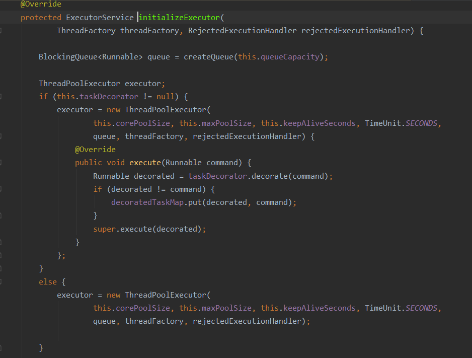 3)、initializeExecutor()方法被ThreadPoolTaskExecutor实现了,所以执行ThradPoolTaskExecutor的initializeExecutor()方法