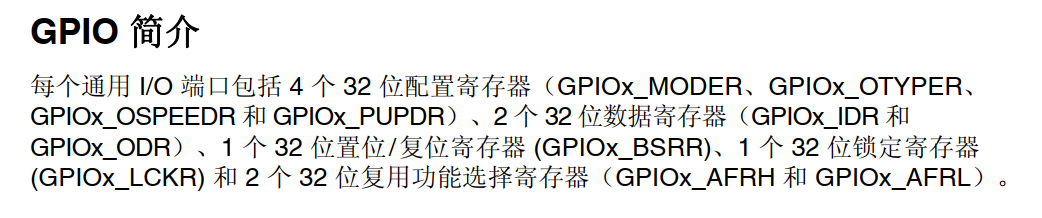 我们这里也介绍一下GPIO的简介。一共有4个32位配置寄存器。2个32位数据寄存器。1个32位置位/复位寄存器。我觉得作为小白这些东西需要背过,1个32位锁定寄存器,和2个32位复用功能选择寄存器