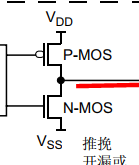 开漏输出简单意思就是上面的PMOS管完全不工作,只有下面的这个NMOS管工作。
