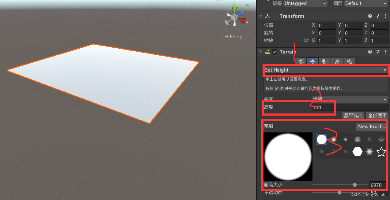 创建地形:在层级面板中的空白处点击鼠标右键创建3D对象,选择地形。在检查器面板中选择绘制地形,选择Set Height,设置一个高度,方便后面绘制沟壑和水,设置完高度后利用笔刷工具将整个地形抬高,之后将Set Height调回第一个,接下来调小画笔大小,选择合适的笔刷就可以绘制山,按住shift绘制可以绘制出沟壑的效果。