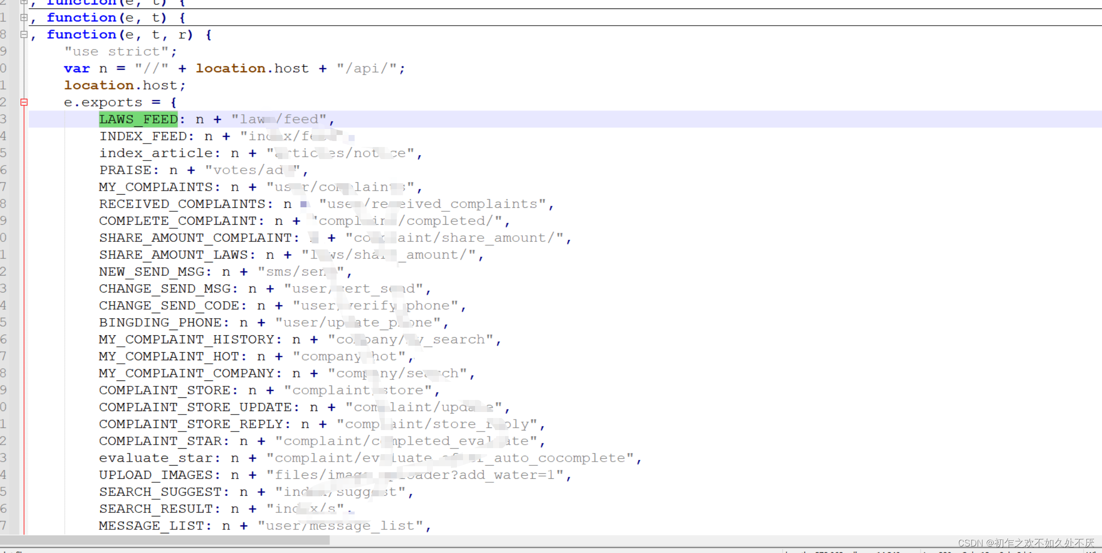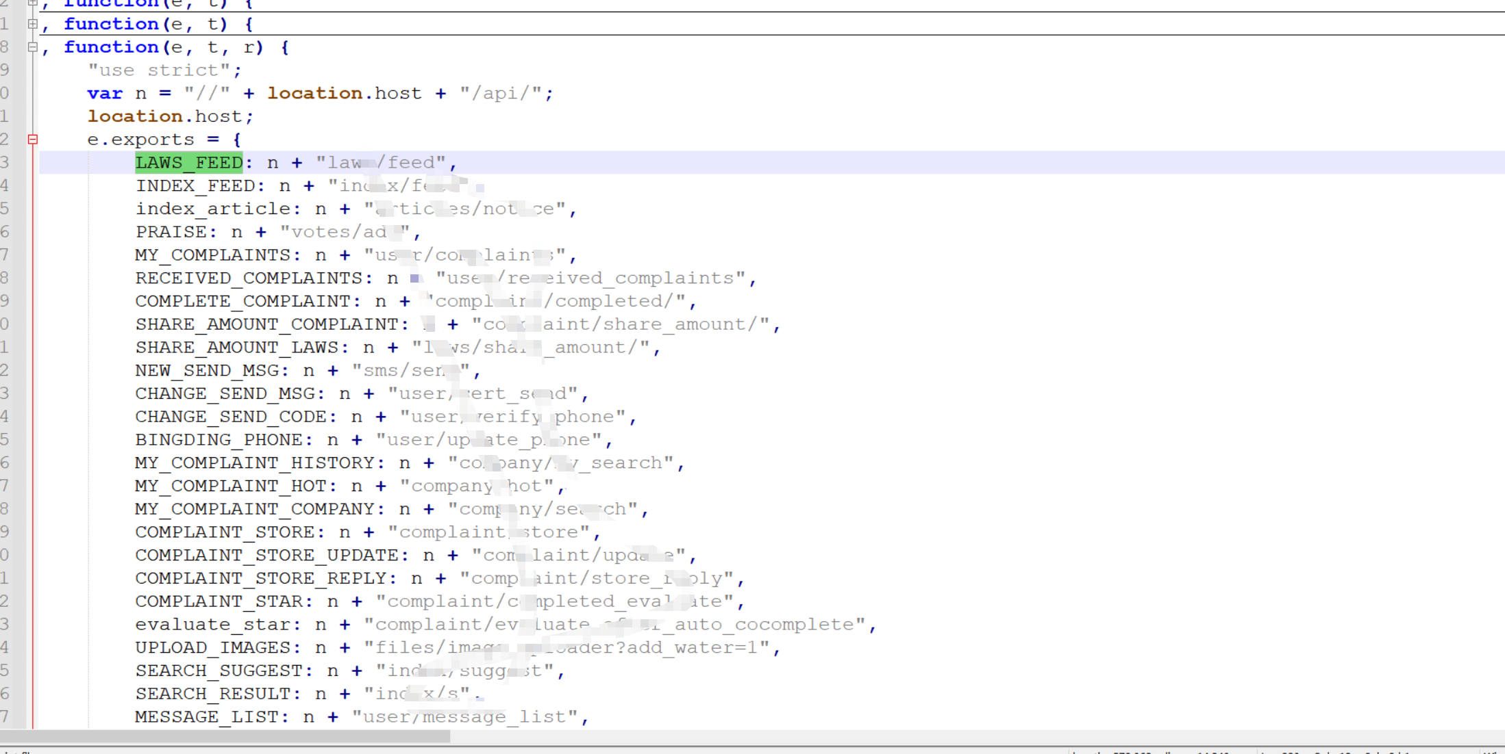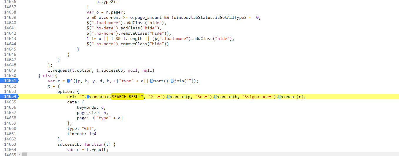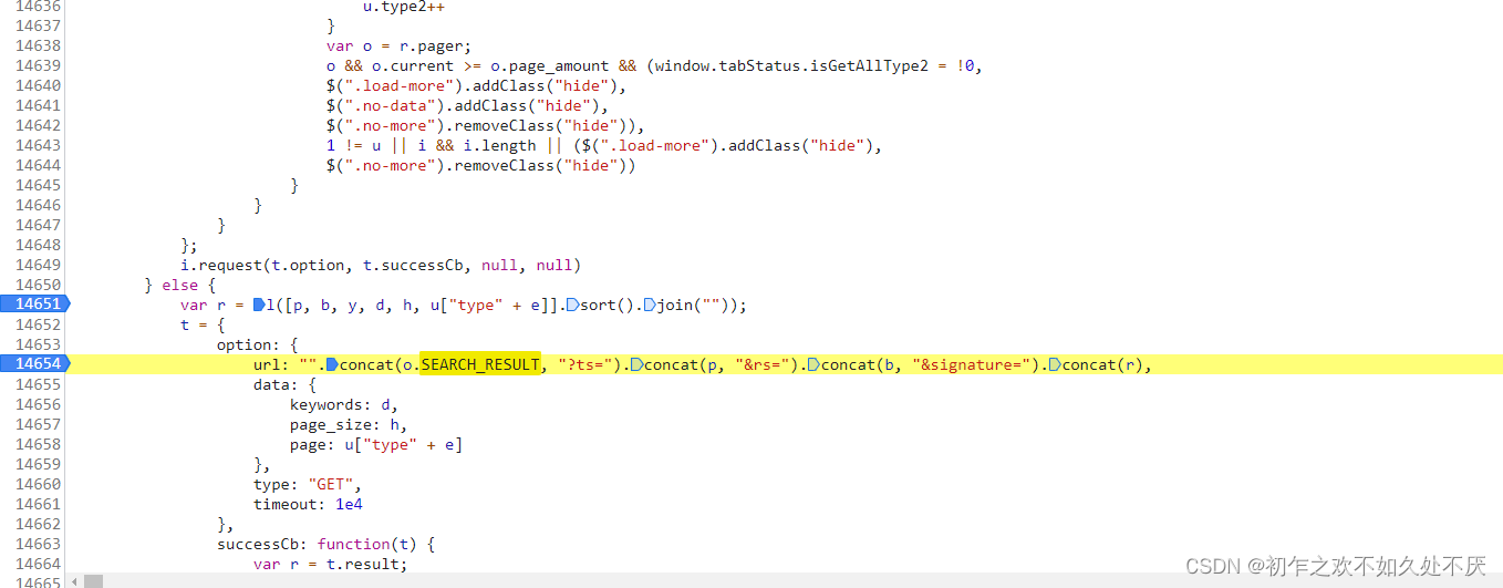 }逆向步骤{1.分析参数{ts: 1647510985452rs: kTYLEM0wEF8NQjvOsignature: 8fd59d909ac559ad5a926e54308d135492ef688b78b163977a143cfbb046495dcallback: jQuery111207311518370923895_1647510985397keywords: 减肥page_size: 10page: 2_: 1647510985399}其中ts、和_目测是时间戳rs、signature、callback不知道是什么含义,其中除了signature外其他两个都没变过2.先从signature入手{a.全局搜索signature没搜索到,最后走的调用栈,找到了发送请求和加密的JS文件b.根据调用栈只找到了发送的入口,依然没找到加密的地方,而且发送入口的URL是被加密后穿过来的c.根据b可以理解未发送入口只是被别的地方当做一个函数调用而已,向上追溯并没有追溯到d.拷贝了整个js文件后观察到exports={LAWS_FEED: n + "laws/feed",INDEX_FEED: n + "index/feed",index_article: n + "articles/notice",PRAISE: n + "votes/add",MY_COMPLAINTS: n + "user/complaints",RECEIVED_COMPLAINTS: n + "user/received_complaints",........SEARCH_RESULT: n + "index/s"}而这其中就有我们发送请求的url参数,然后针对SEARCH_RESULT全局搜索,果然找到了}3.破解加密参数{l([p, b, y, d, h, u["type" + e]].sort().join(""));p:时间戳 √b:"kTYLEM0wEF8NQjvO"y:"$d6eb7ff91ee257475%" =>js文件中的固定值d:关键词h:10u["type" + e]]}