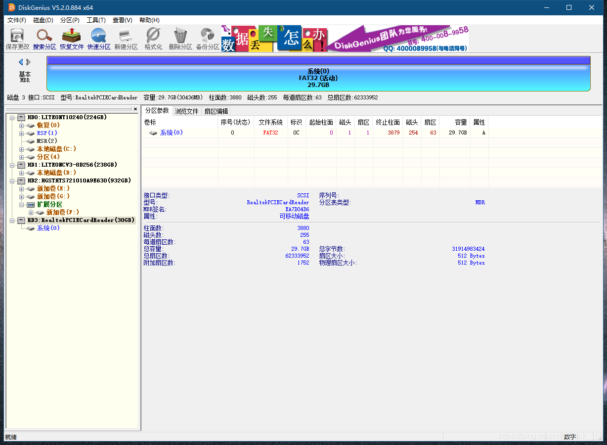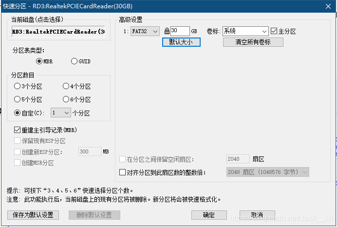 之后右键SD卡盘,快速分区,注意选择自定义1个分区、使用FAT32,同时去掉对其扇区整数倍的勾,大小我是选的默认大小。