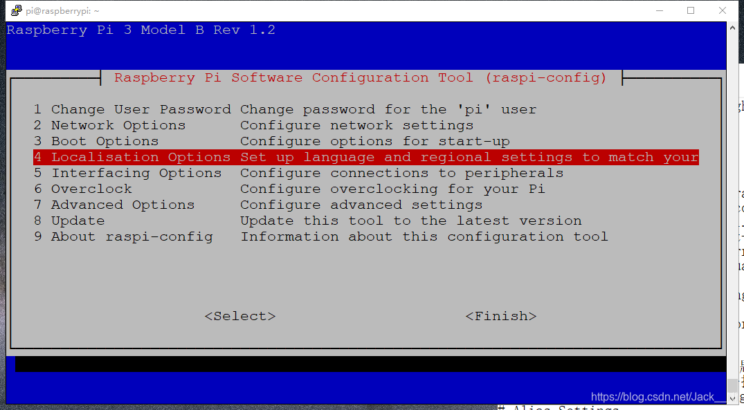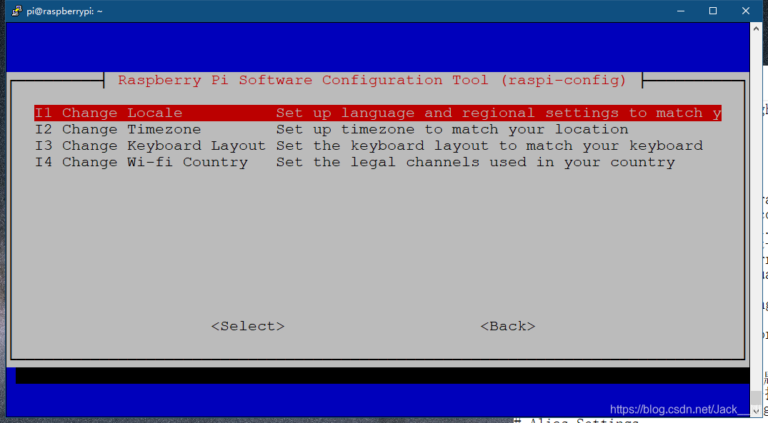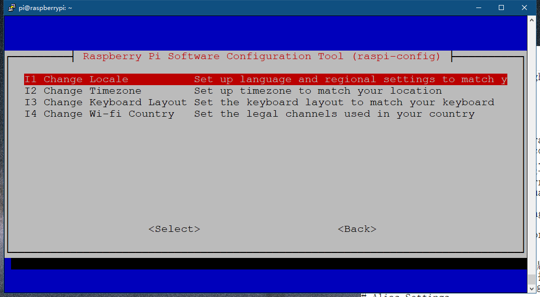 进入树莓派的设置中心,使用方向按键控制上下,使用回车或esc键控制进退,选择4 Localisation Options --> I1 Change Locale进入语言设置。