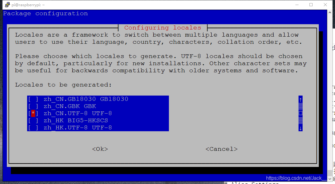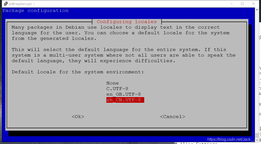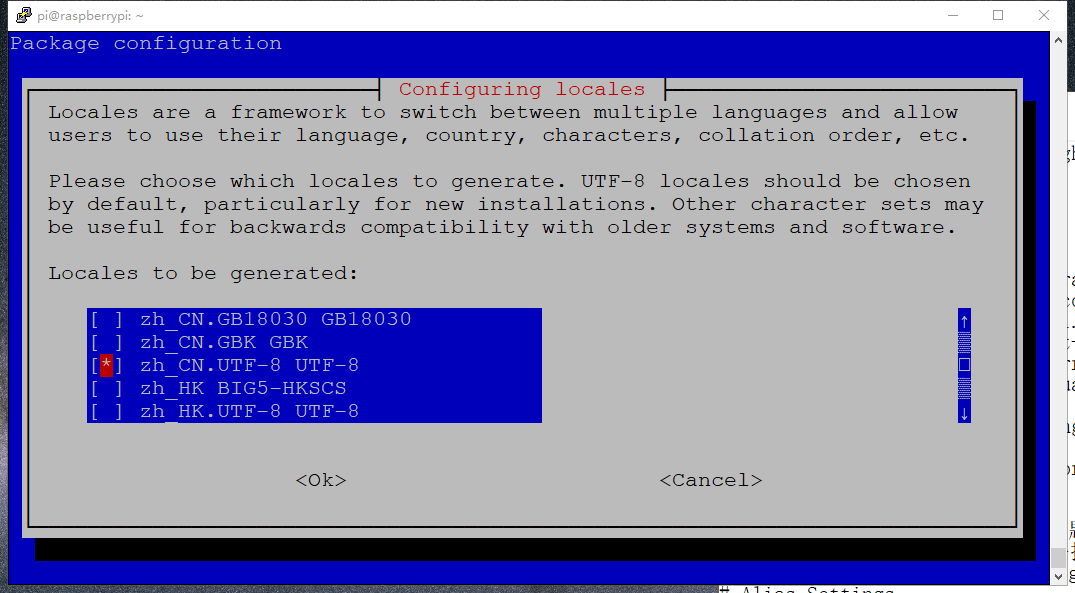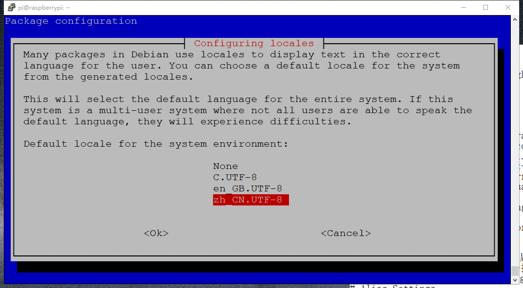 按下回车键后,进入默认语言选择,这里选择zh_CN.UTF-8,光标选择后按下回车,树莓派自动进行中文替换。