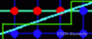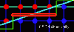 要怎么确定边缘方向呢?FXAA里给的方法是判断终点是不是和当前点在同一个区域,比如这里都从左侧的红点向右查找终点,就会发现根据倾斜方向不同终点位于红色或者蓝色区域: