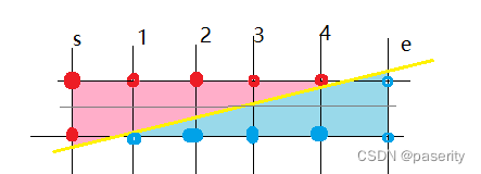 首先为什么3点有BlendFactor而2没有呢?这是因为2点像素范围内还没有接触到蓝色区域,而到3点时才开始有。接触到蓝色区域可以简化为像素范围有没有越过水平的中线,就是上图中灰色的线条,灰色线条既是像素的中线,同时也是s~e区域范围内黄色边缘线的水平中线(根据对称性),那么很显然s和e的中间位置((s+e)/2)就是判断像素范围开始接触到蓝色区域的临界点。所以在s和e中间的点中,必定一半需要Blend,一半不需要。