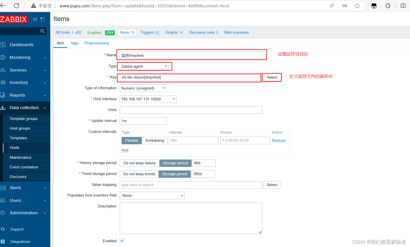 创建监控项:在Zabbix服务器上创建监控项,用于收集主机的各种指标数据,比如CPU使用率、内存使用率等。