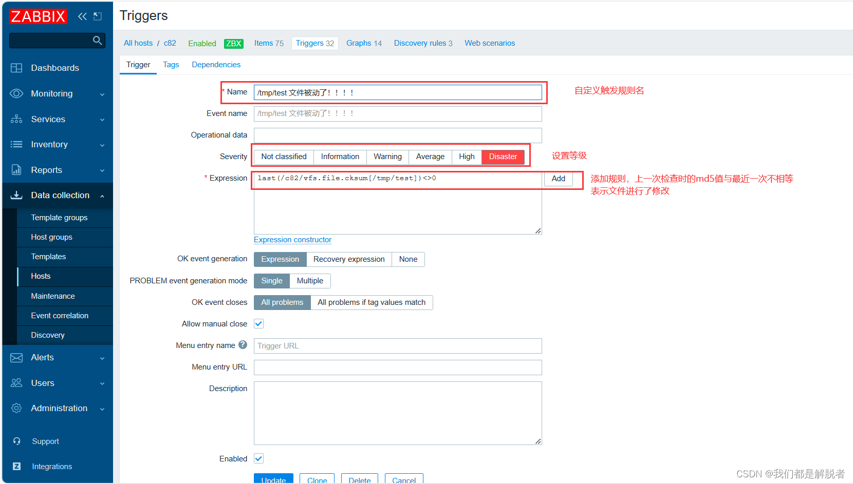 创建触发器:定义触发器来监测监控项的值,当达到预设的阈值时,触发器将产生一个事件。