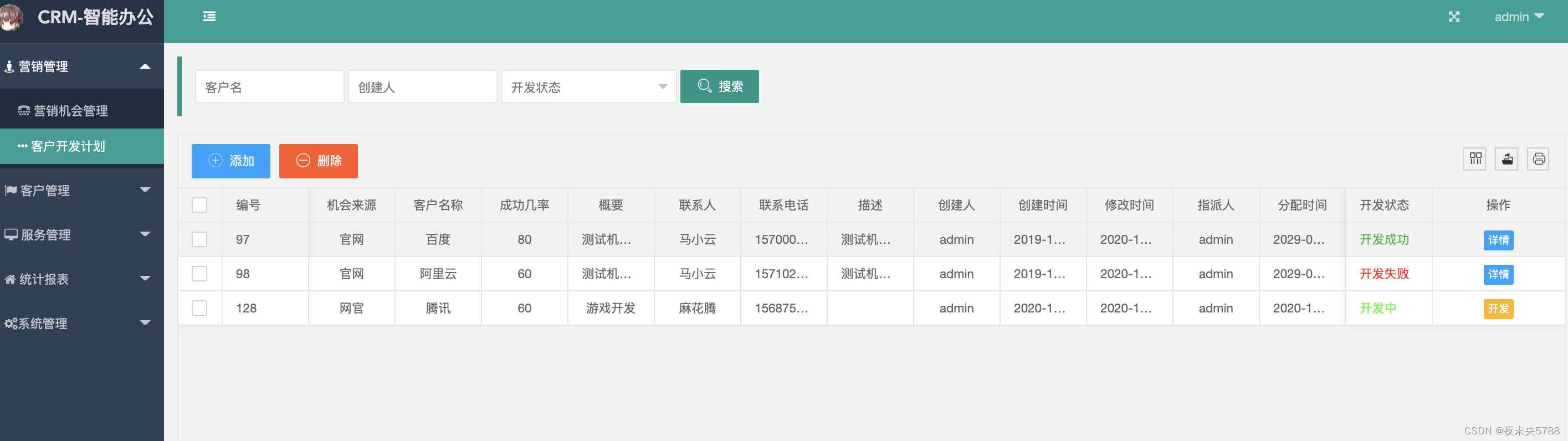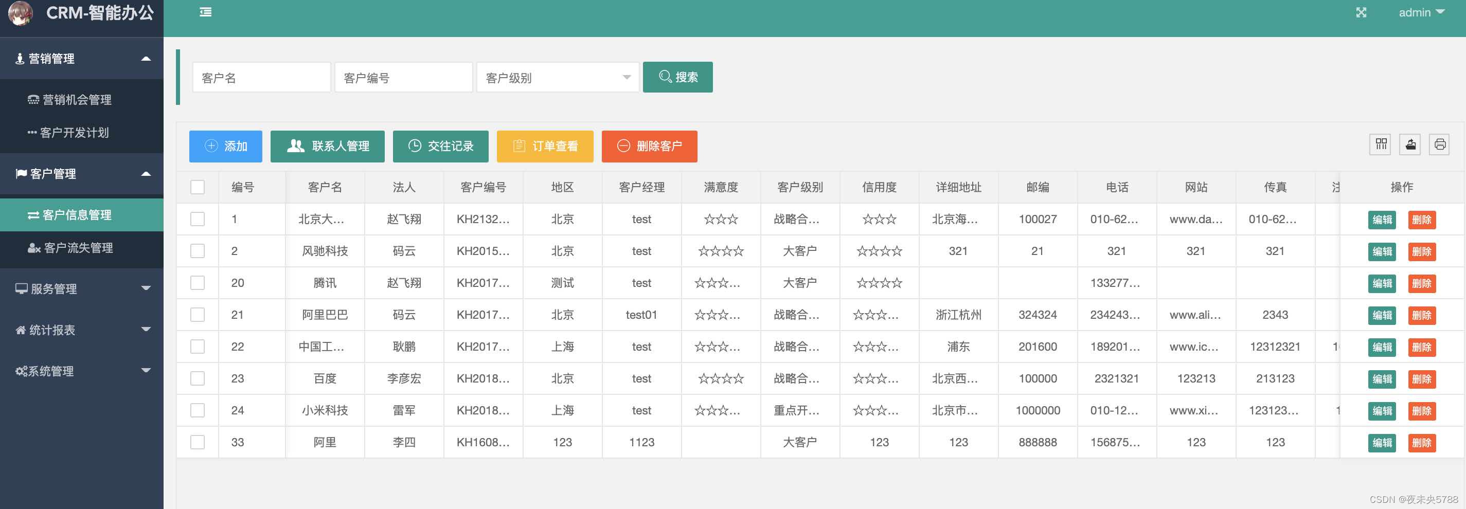 - 本应用是一个客户关系管理系统,主要包括五大模块,分别是营销管理,客户管理,服务管理,统计报表和系统管理,为客户关系管理提供简单的数据管理与分析