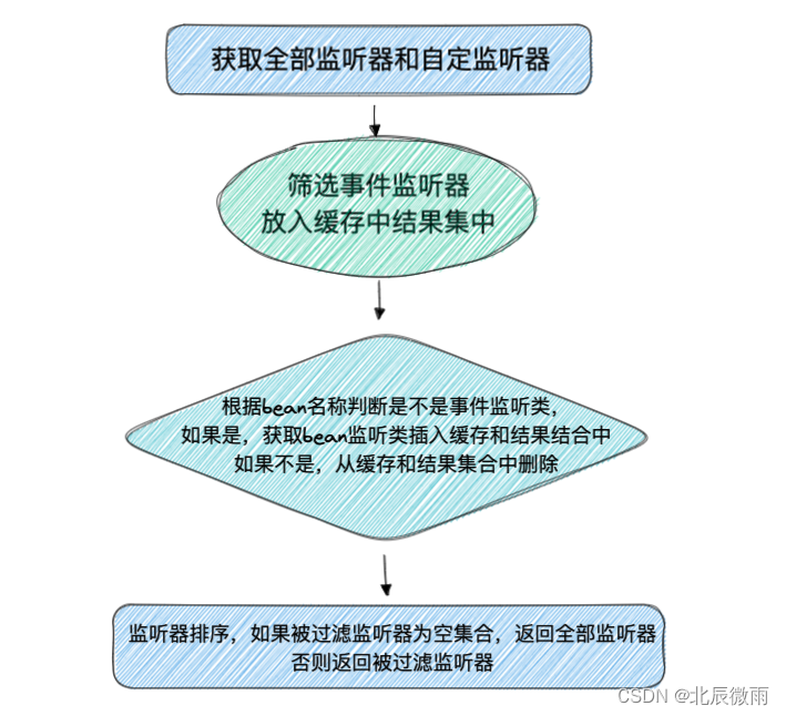 private Collection> retrieveApplicationListeners(ResolvableType eventType, @Nullable Class> sourceType, @Nullable AbstractApplicationEventMulticaster.CachedListenerRetriever retriever) {//所有的监听器,作为结果返回List> allListeners = new ArrayList();//filteredListeners和filteredListenerBeans用来缓存被过滤监听器的数据//如果retriever不为null会新创建集合存放Set> filteredListeners = retriever != null ? new LinkedHashSet() : null;Set filteredListenerBeans = retriever != null ? new LinkedHashSet() : null;//存储监听类LinkedHashSet listeners;//存储String类型的Bean名称LinkedHashSet listenerBeans;//当前回收器加锁synchronized(this.defaultRetriever) {//将全部监听类放入listeners中listeners = new LinkedHashSet(this.defaultRetriever.applicationListeners);//自定义监听类放入listenerBeanslistenerBeans = new LinkedHashSet(this.defaultRetriever.applicationListenerBeans);}//获取全部监听器的遍历器Iterator var9 = listeners.iterator();//遍历全部监听器while(var9.hasNext()) {//当前遍历监听器ApplicationListener> listener = (ApplicationListener)var9.next();//筛选是否支持事件的监听类if (this.supportsEvent(listener, eventType, sourceType)) {//如果缓存参数retriever存在,则往缓存集合存入数据if (retriever != null) {filteredListeners.add(listener);}//加入结果中allListeners.add(listener);}}//自定义监听器不为nullif (!listenerBeans.isEmpty()) {//获取bean工程和自定义监听器的遍历器ConfigurableBeanFactory beanFactory = this.getBeanFactory();Iterator var16 = listenerBeans.iterator();//自定义监听器遍历while(var16.hasNext()) {//当前遍历的监听器bean名称String listenerBeanName = (String)var16.next();try {//筛选是否是事件对应的监听类if (this.supportsEvent(beanFactory, listenerBeanName, eventType)) {//以监听器名称通过beanFactory获取监听器ApplicationListener> listener = (ApplicationListener)beanFactory.getBean(listenerBeanName, ApplicationListener.class);//如果结果集合allListeners中不存在该监听类并且是事件对应的监听类if (!allListeners.contains(listener) && this.supportsEvent(listener, eventType, sourceType)) {//如果缓存参数retriever存在,则忘缓存集合填充数据,区分单例if (retriever != null) {if (beanFactory.isSingleton(listenerBeanName)) {filteredListeners.add(listener);} else {filteredListenerBeans.add(listenerBeanName);}}//结果集合填充监听器allListeners.add(listener);}} else {//不是事件监听器//以监听器名称通过beanFactory获取当前单例对象Object listener = beanFactory.getSingleton(listenerBeanName);//如果缓存retriever存在,缓存集合移除数据if (retriever != null) {filteredListeners.remove(listener);}//结果集合移除监听器allListeners.remove(listener);}} catch (NoSuchBeanDefinitionException var13) {}}}//通过order或者实例排序AnnotationAwareOrderComparator.sort(allListeners);//如果缓存retriever存在if (retriever != null) {//如果过滤监听bena是空,全部监听器填充为应用监听器,否则指向被过滤监听器if (filteredListenerBeans.isEmpty()) {retriever.applicationListeners = new LinkedHashSet(allListeners);retriever.applicationListenerBeans = filteredListenerBeans;} else {retriever.applicationListeners = filteredListeners;retriever.applicationListenerBeans = filteredListenerBeans;}}//返回全部监听器return allListeners;}
