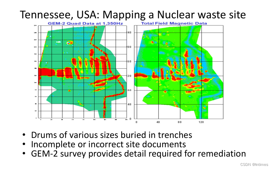 美国田纳西州的一处核污染地, 在沟里有大小不一的鼓包,而相关资料不完整或者不对,用GEM2仪器进行探测,获得了详细结果,对资料进行了修正和补救。