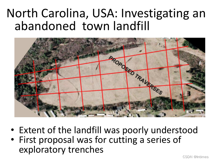 美国 北卡罗来纳州,调查了一处废弃的垃圾堆填地,想要获取填埋地的具体范围。最开始提出的办法是挖出一批壕沟来查探一下。