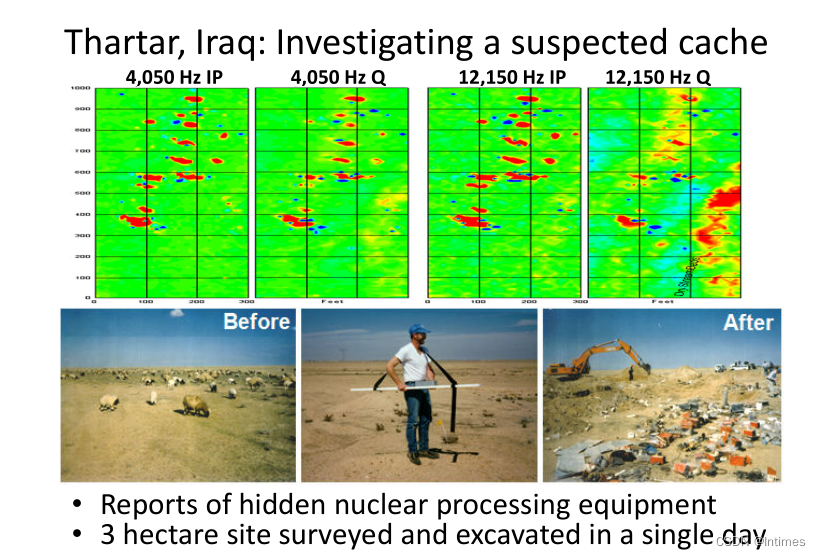 在伊拉克的Thartar地区,调查了一个可疑的隐藏地,用GEM2调查并报告了隐藏核处理设备的可疑位置,3公顷的面积用了1天就完成了调查和挖掘工作。
