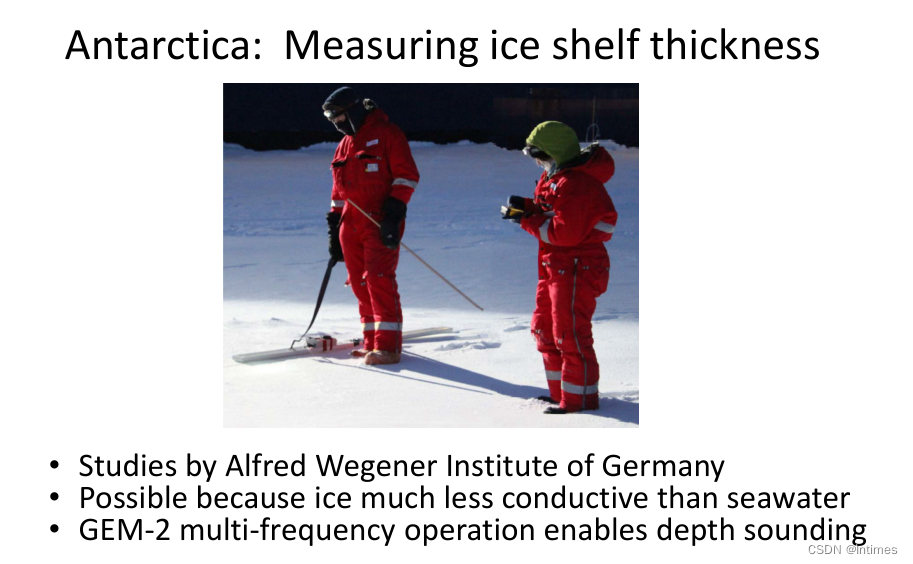在南极洲开展了冰假厚度的探测,这个工作是德国阿尔弗雷德·魏格纳研究所开展的,可能是因为海水比冰更加导电,所以可以开展探测,GEM2仪器实现了测深探测。(贴着冰面探测的)
