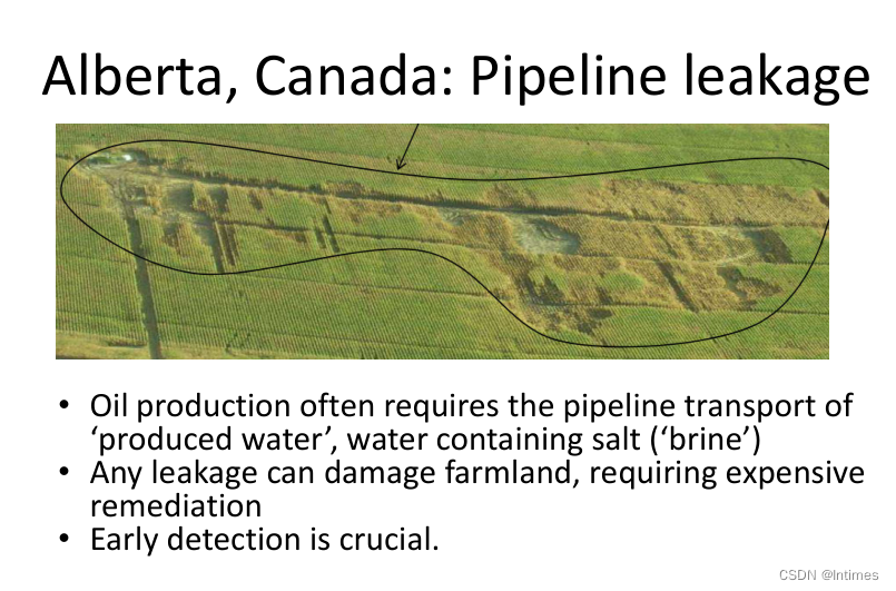 在加拿大阿尔伯特,调查了管道泄漏问题。石油生产通常需要管道输送“采出水”,即含盐的水(“盐水”)。一旦泄漏就会破坏农田,需要昂贵的补救措施。因此,早期的探测是很重要的。