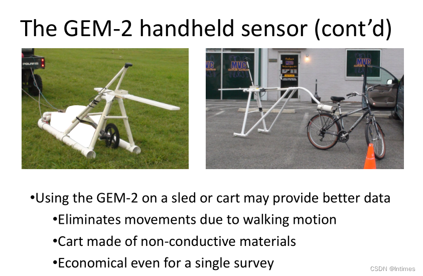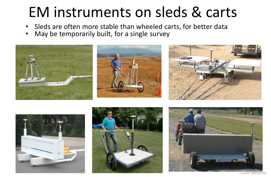 这张图展示了各种多频电磁探测装备,适用于各类场合。雪橇拖行类的往往比轮式的更好,因为没有晃动。对临时的小项目,可以临时定制这种搭载工具。